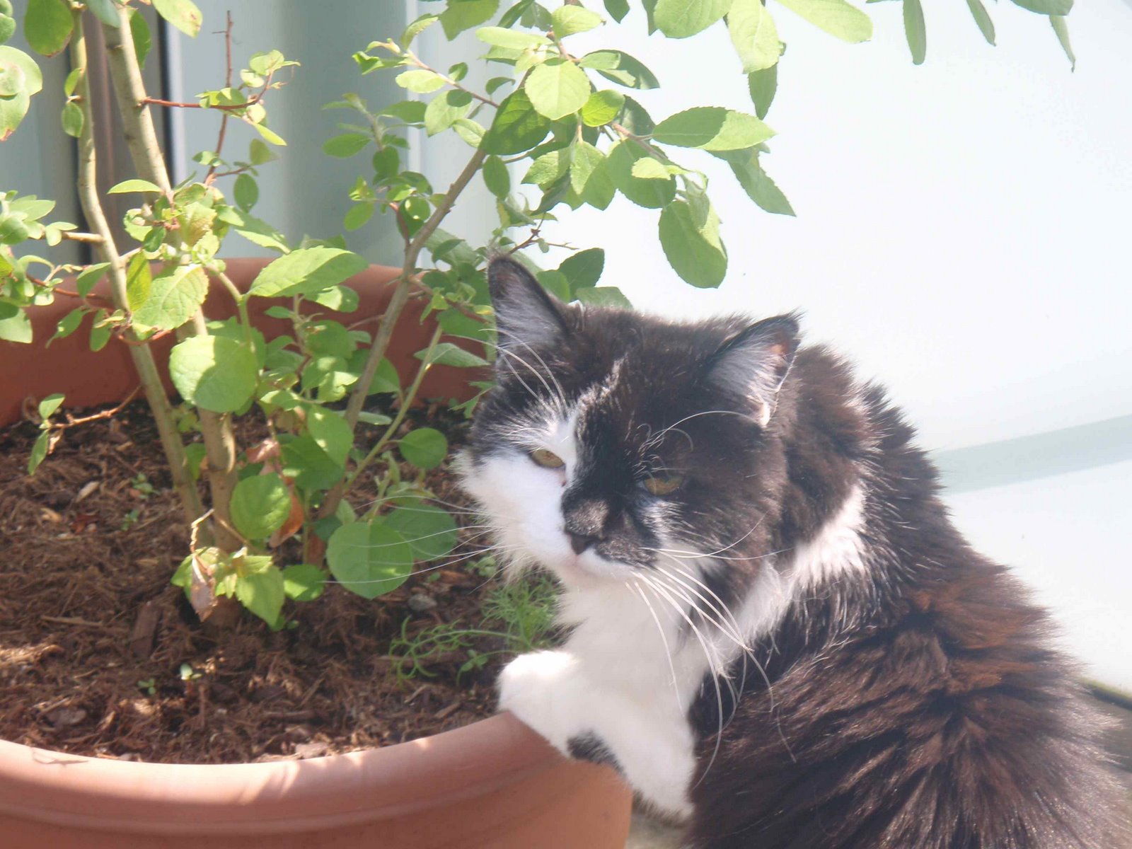 Some kitties like cat grass or special cat nip treats - Well, our Morgan prefers weeds.After the winter we started cleaning off the balcony, removing debris and dead plants. Within one big pot of old, dried-out flowers and other botanical species, a small, fresh weed was found growing. During Thumper's short tours out on the balcony, she started to nibble away on this particular weed. Every time she went out, she went straight to this little, growing weed and nibbled its leaves, and so we decided we had to keep it. Nowadays, you'll find that the weed has been transferred to a brand new big pot, and it's the tallest plant on the whole balcony - yes, the cat's weed!